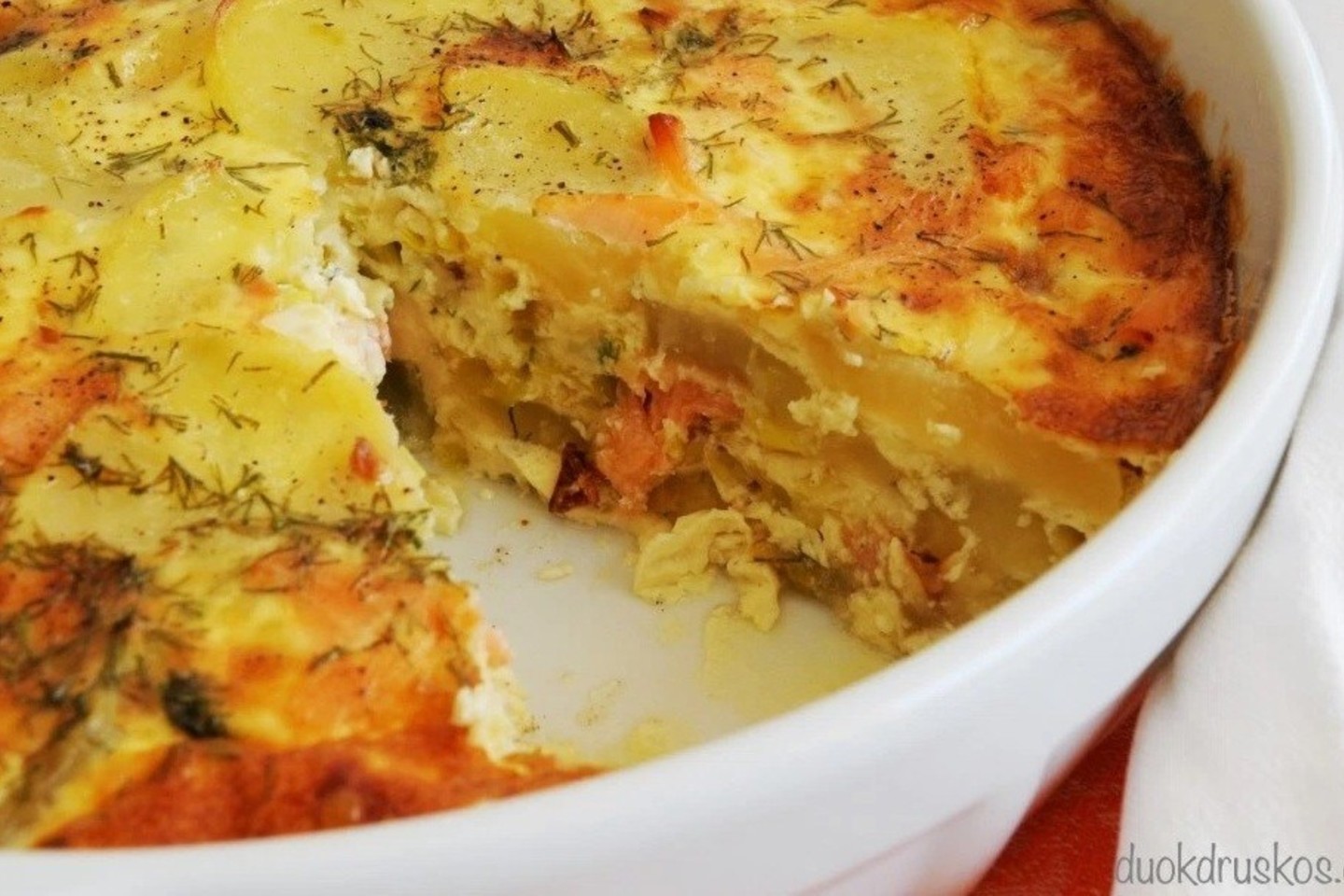 Formos dugną išklokite maždaug trečdaliu virtų bulvių, berkite pusę keptų porų ir pusę lašišos, berkite žiupsnelį krapų, vėl dėkite bulvių, porų, lašišos, krapų ir vėl ant viršaus bulvių.