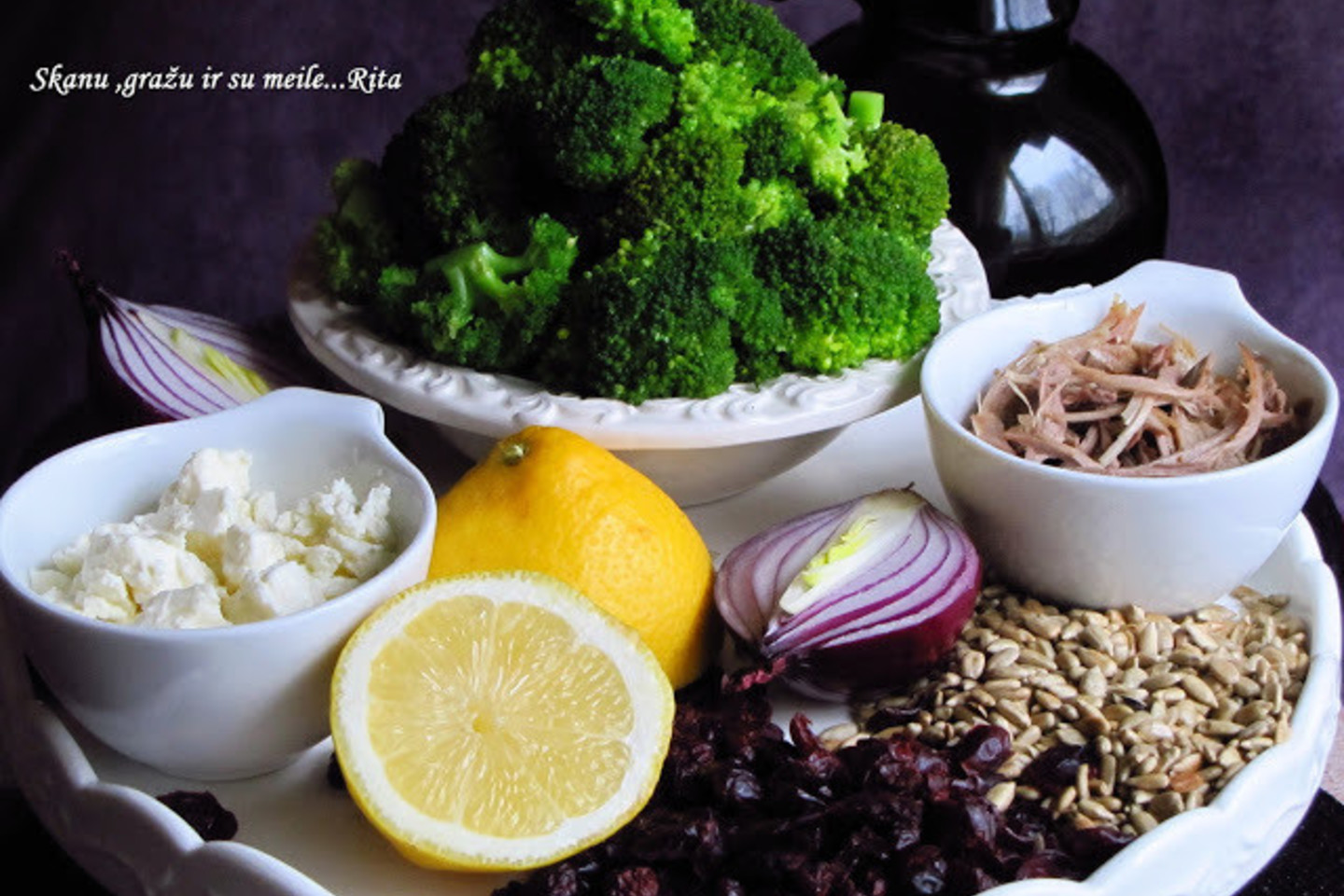 1. Brokolį susmulkinti ir nuplikyti verdančiu vandeniu. Atvėsinti ir gerai nusausinti.
