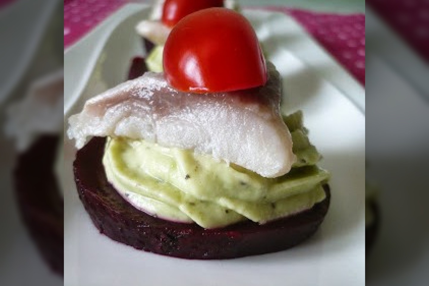 Ant burokėlio griežinėlio išspausti avokado masės konditeriniu maišeliu, uždėti silkės gabaliuką ir papuošti pomidoro pusele.