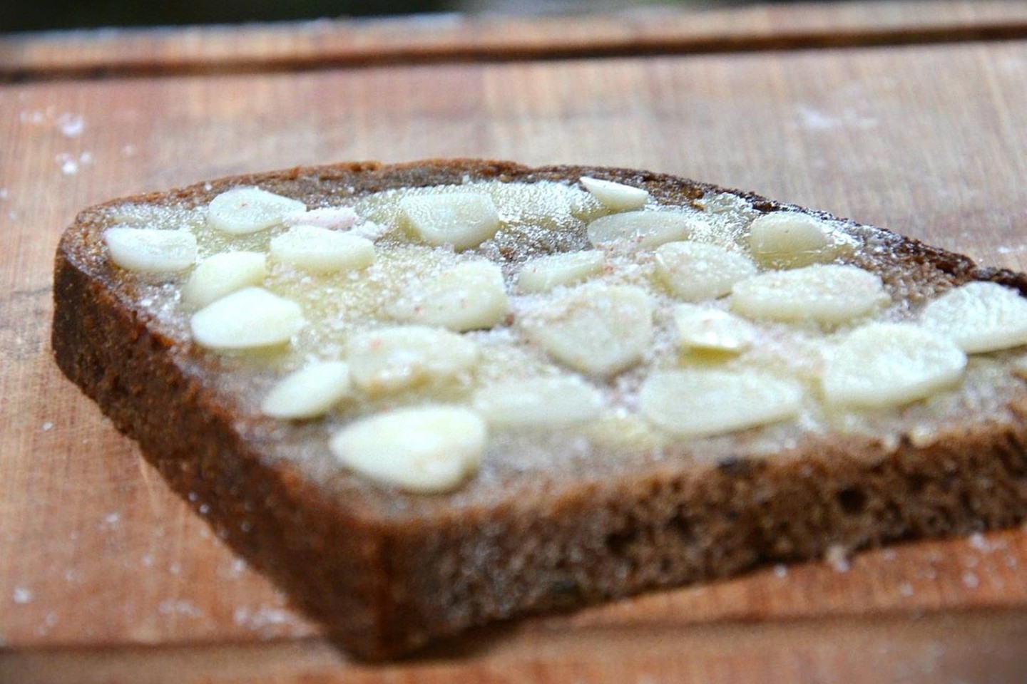 Riekę gausiai aptepu lydytu sviestu, labai plonais griežinėliais supjaustau 3 česnako skilteles, jas tolygiai išdėlioju ant sviestu teptos duonos ir galiausiai pabarstau rupia druska. Valgau ne daugiau nei tris per dieną.