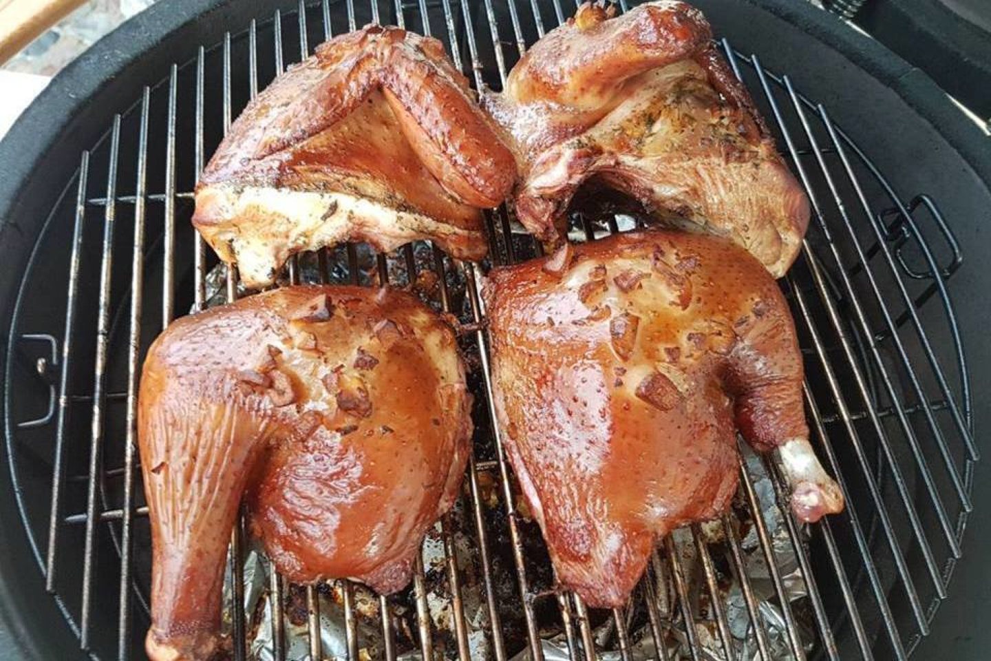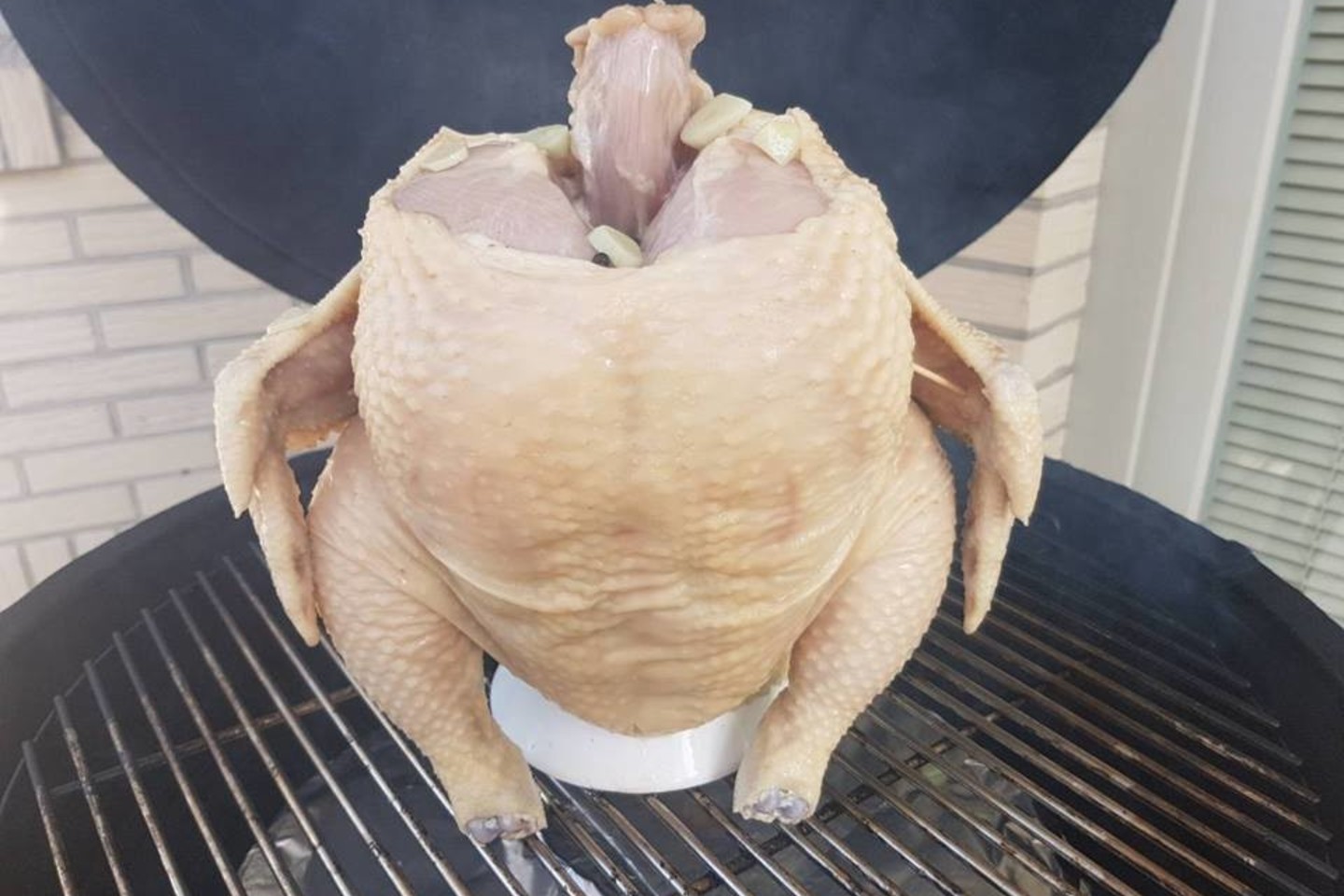 Kol ji pliuškenasi, aš užkuriu kepsninę. Ant įkaitusių anglių dedu alksnio šakelių, temperatūrą užkeliu iki 110 C. Tiesa, kepu ne virš tiesioginės kaitros, vištą nuo žarijų skiria kepimo akmuo.