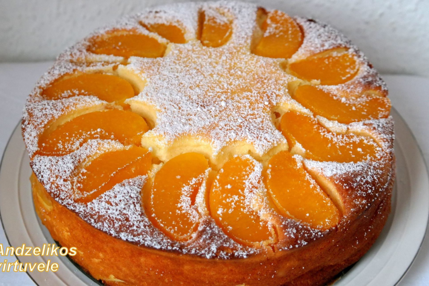 Paruoštą masę supilti į išteptą sviestu kepimo formą, ant viršaus išdėlioti likusius persikus.