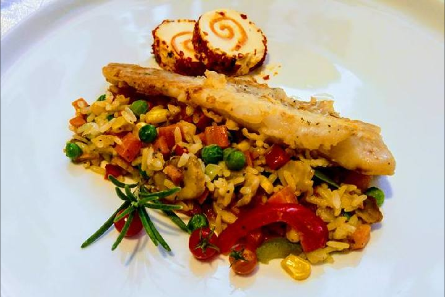 Ant lėkštės dedame daržovių „pagalvę“. Ant jos dedame žuvį. Galima papuošti rozmarino šakele ir mažais pomidorais.