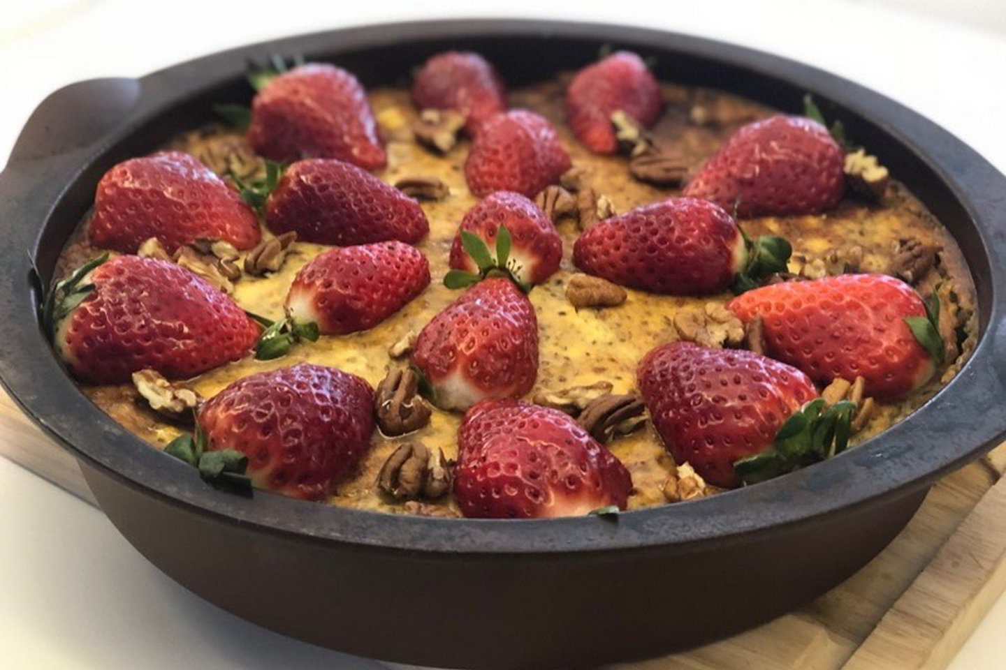 Iškeptą gardinkite braškėmis, riešutais, medumi, klevų arba agavų sirupu.
