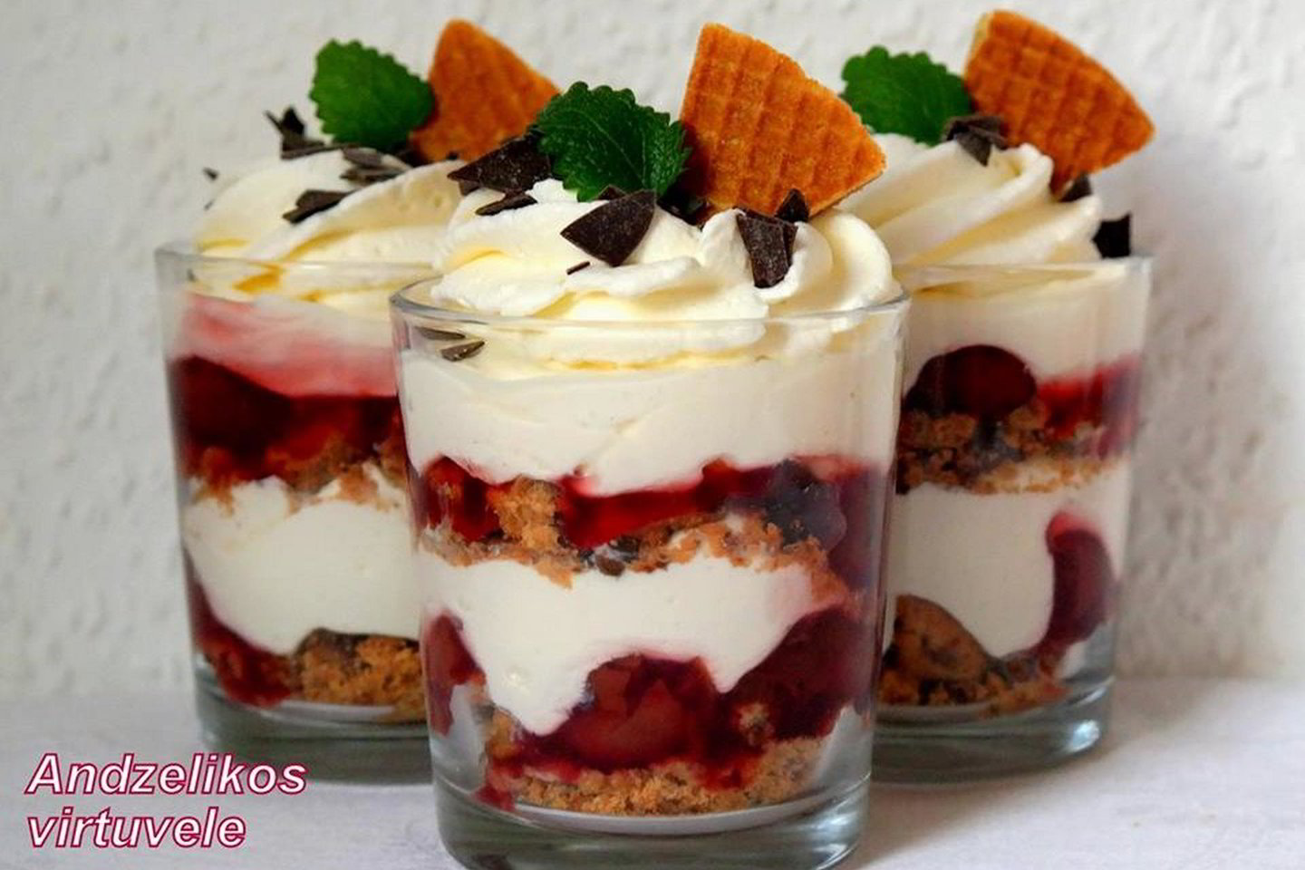 Dėti desertą maždaug 1 val. į šaldytuvą. Prieš patiekiant papuošti plakta grietinėle ir pabarstyti šokolado drožlėmis.