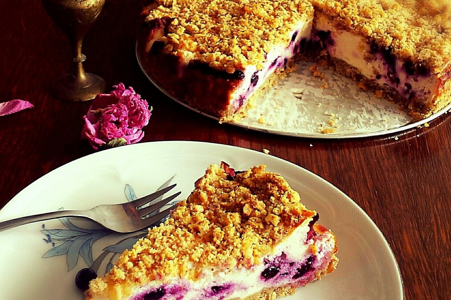 Šilkinis varškės ir mėlynių pyragas su traškiu viršumi