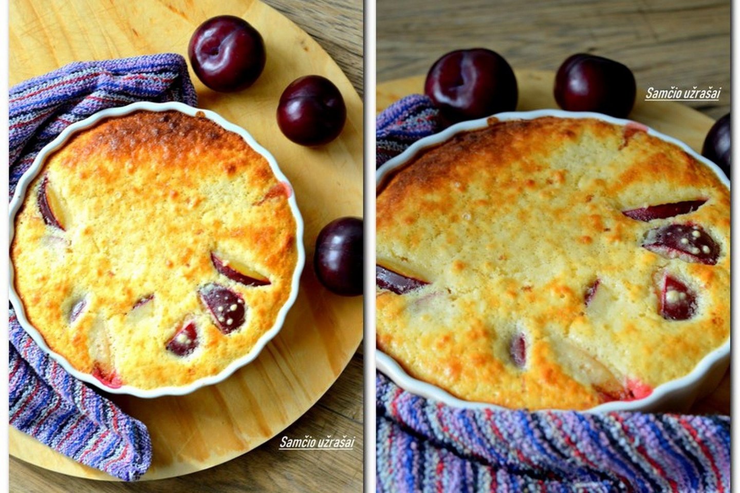 Slyvas perpjaukite pusiau ir tada kiekvieną puselę dar į tris dalis, sudėkite slyvas ant kepimo indo dugno. Užberkite cinamono ant slyvų. Užpilkite tešlą ant viršaus ir dėkite kepti į orkaitę apie 45 min. arba, kol pyragas iškeps.