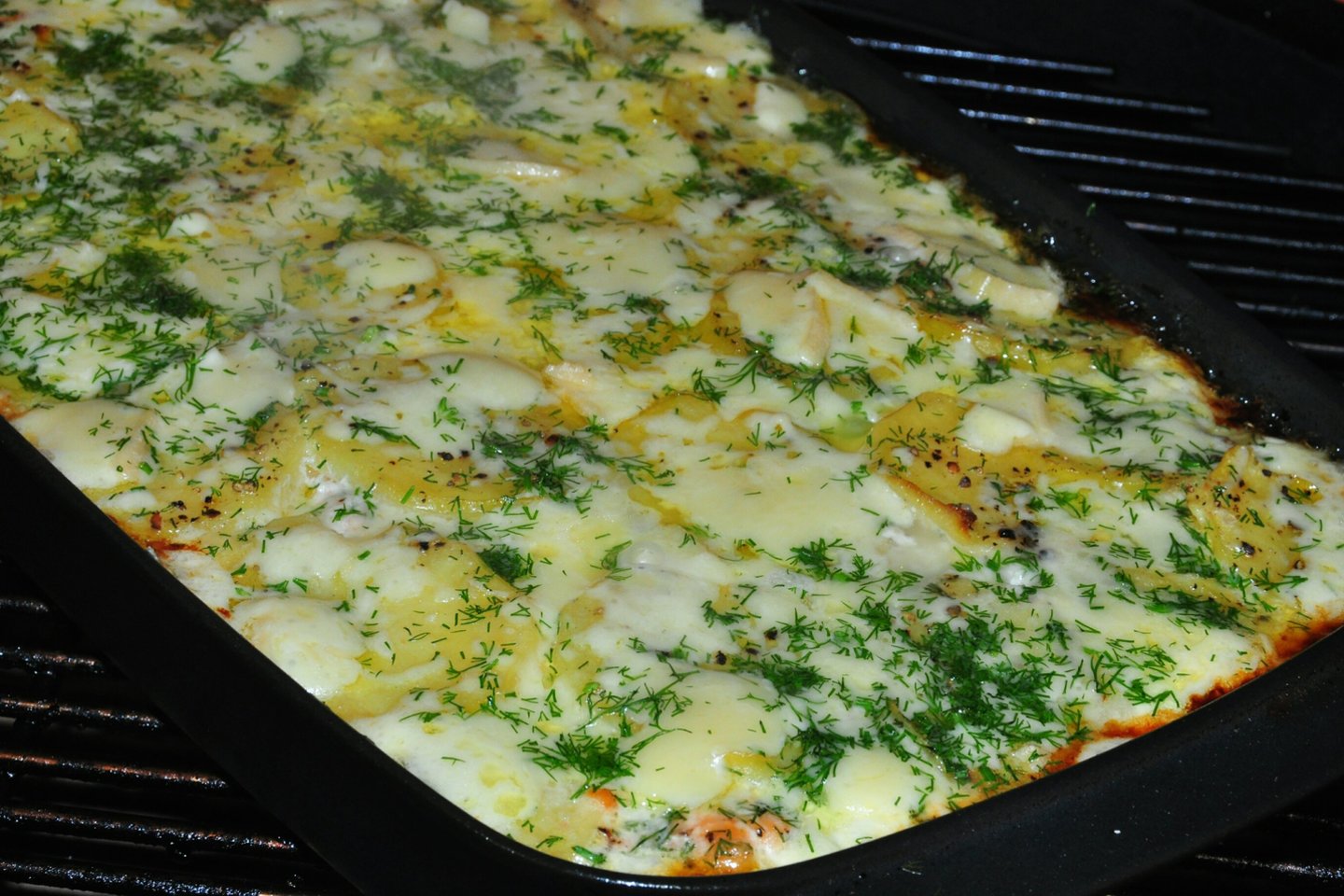 Bulves apverdame ir supjaustome griežinėliais. Kepimo indą patepame aliejumi ir sluoksniuojame – bulvės, lašiša, krapai, druska, pipirai...