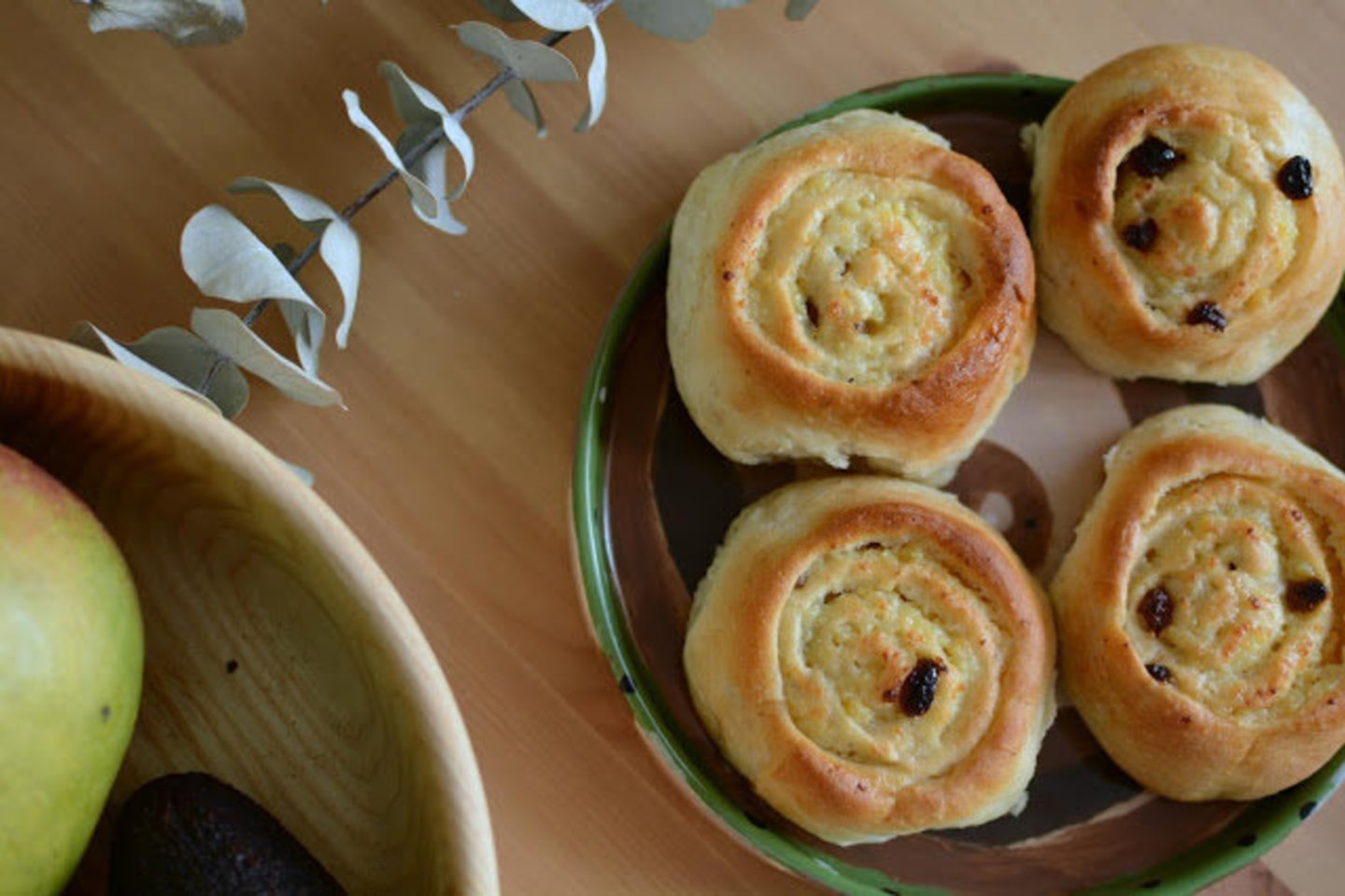 Tešlą padenkite įdaru, pabarstykite razinomis. Susukite į ritinį, jį supjaustykite į 8 lygias dalis.