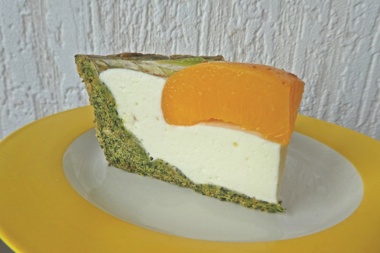 Tuomet išdėlioti persikų puselės – „kiaušinius“, ant jų atsargiai supilti likusį kremą, kurį patartina laikyti dubenyje, įmerktame į šiltą vandenį, kad nesutirštėtų, kol bus pilamas ant torto.