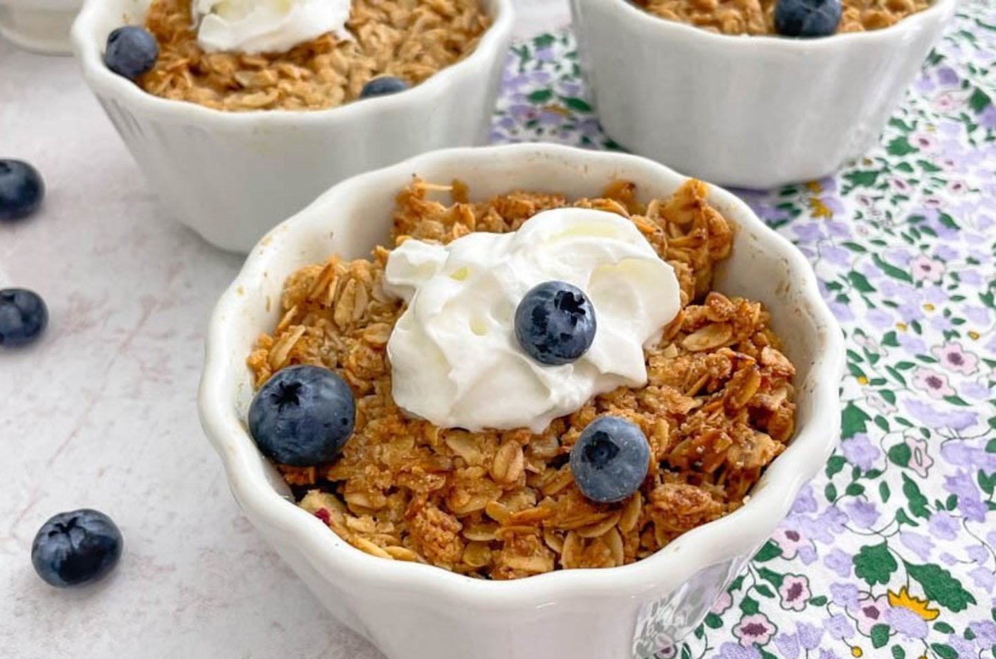 Atskirai sumaišyti dribsnius, miltus, cukrų ir sviestą. Juos uždėti ant obuolių, lengvai paspausti į apačią.