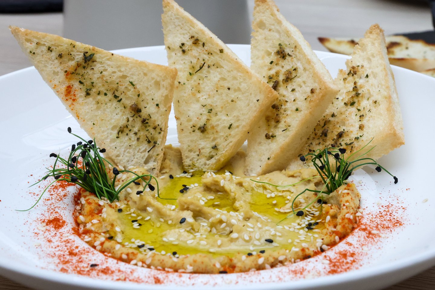 Prie humuso tinka skrudinta balta duona, pagardinkite užkandį alyvuogių aliejumi.