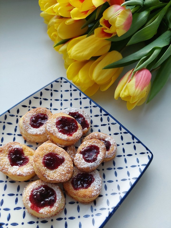 Ištraukiame iš orkaitės, į padarytas duobutes šaukšteliu įdedame džemo.