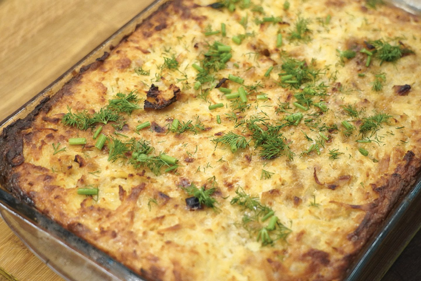 Sudėkite graikišką jogurtą, viską gerai sumaišykite ir uždenkite, kad neatvėstų. Iškepusį kugelį pabarstykite smulkintais krapais ir patiekite su padažu. Ir nepamirškite – paskutinis gabalėlis atitenka tam, kuris skuto bulves!