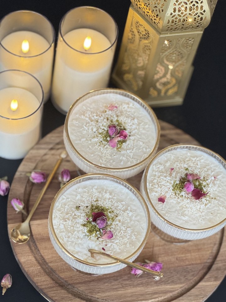 Tada pagardinami vanilės ekstraktu, rožių ir apelsinų žiedų vandeniu. Pistacijos ir kokosų drožlės pudingui suteikia papildomos traškios tekstūros.