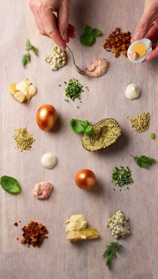 Virtą kiaušinį dalinkite į keturias dalis ir kiekvieną ketvirtį ragaukite vis su kitu pagardu. Miksuokite juos, derinkite skirtingus skonius ir pagardų tekstūras.