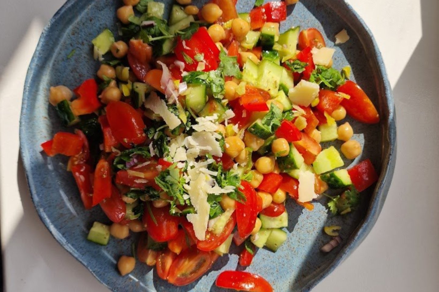 Jei norisi valgyti dar sočiau, galima šalia tokių salotų įsiberti grikių kruopų, likusių nuo pusryčių.