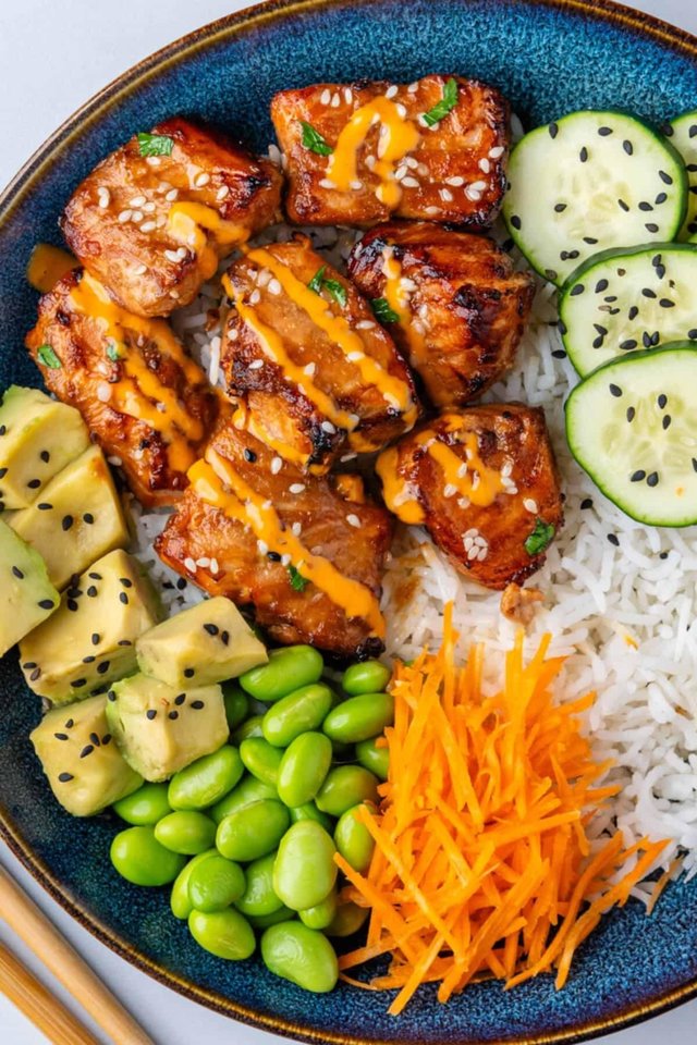 Indelyje sumaišome sojos padažą, skrudintų sezamų aliejų, ryžių actą, įtarkuojame česnaką ir imbierą. Lašišą supjaustome kubeliais, dedame į dubenį. Užpilame pusę paruošto padažo. Uždengiame maistine plėvele ir marinuojame apie 30 minučių ir kepame karšto oro gruzdintuvėje ~10 min. Išverdame ryžius. Supjaustome agurką, avokadą, sutarkuojame morką. Edamame pupeles pakepiname kelias minutes. Į indelius dedame ryžius, juos apipilame puse likusio padažo. Ant viršaus dėliojame keptą lašišą, agurką, avokadą, edamame pupeles, morką. Pabarstome sezamo sėklomis.