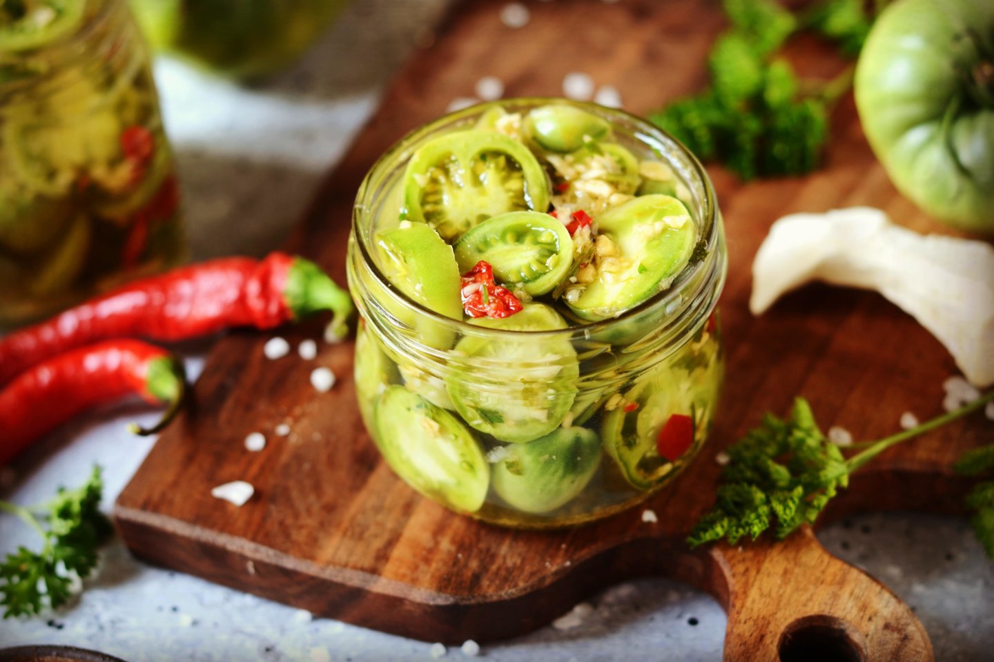 Marinuoti žalieji pomidorai su aitriąja paprika