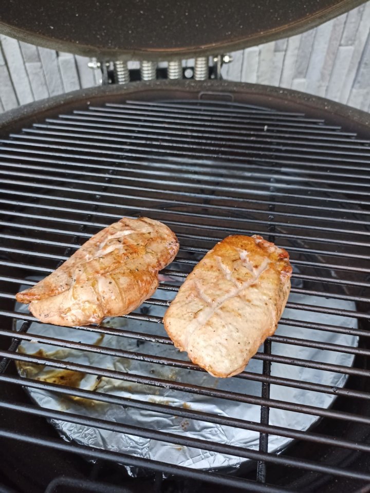Dedame ant įkaitintų grotelių su tiesiogine kaitra (odele žemyn) ir pakepame 1–2 minutes, kol odelė apskrus ir „užrakins“ mėsos sultingumą.