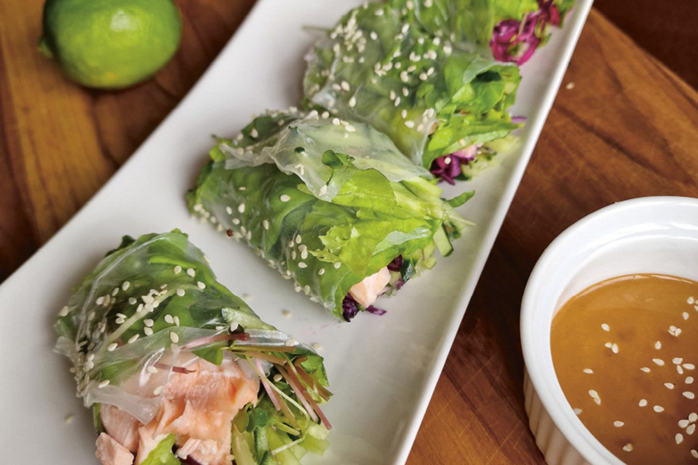Minkštus ryžių lapus sudėkite taip, kad įdaru pasidengtų jų ketvirtadalis arba trečdalis. Galima vynioti ir kiekvieną atskirai. Atminkite, kad sudrėkę lapai limpa kaip lipnioji juosta, tad sukite atsargiai. Palikite kraštelį neuždengtą daržovėmis – sulipimui, jei kas sukote sušius, principas toks pat.