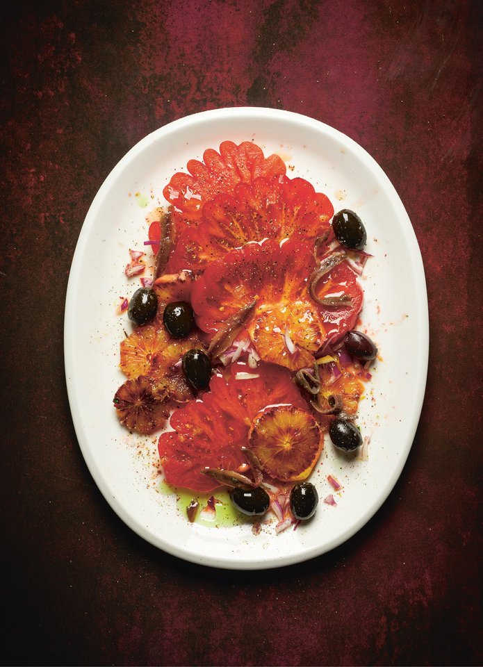 POMIDORŲ SALOTOS SU ANČIUVIAIS IR APELSINAIS