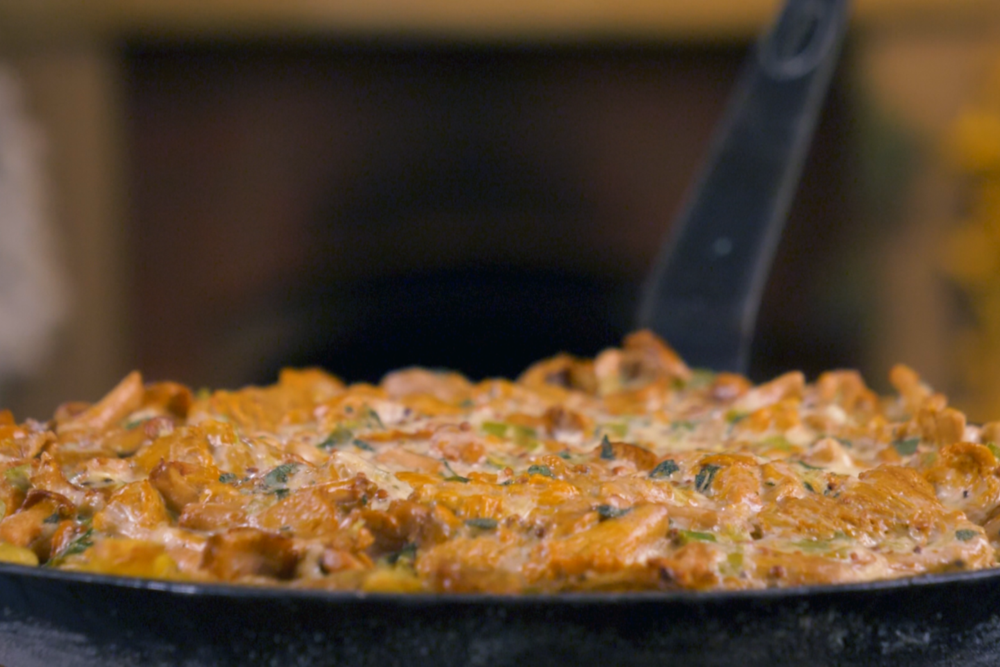 Kol kepa bulvinis pagrindas, paruoškite pyrago įdarą. Porą supjaustykite ir pakepinkite aliejuje ar svieste. Į tą pačią keptuvę sudėkite nuvalytas voveraites ir troškinkite tol, kol jos sukris ir taps minkštos. Nuo voveraičių susidariusį vandenį nupilkite.