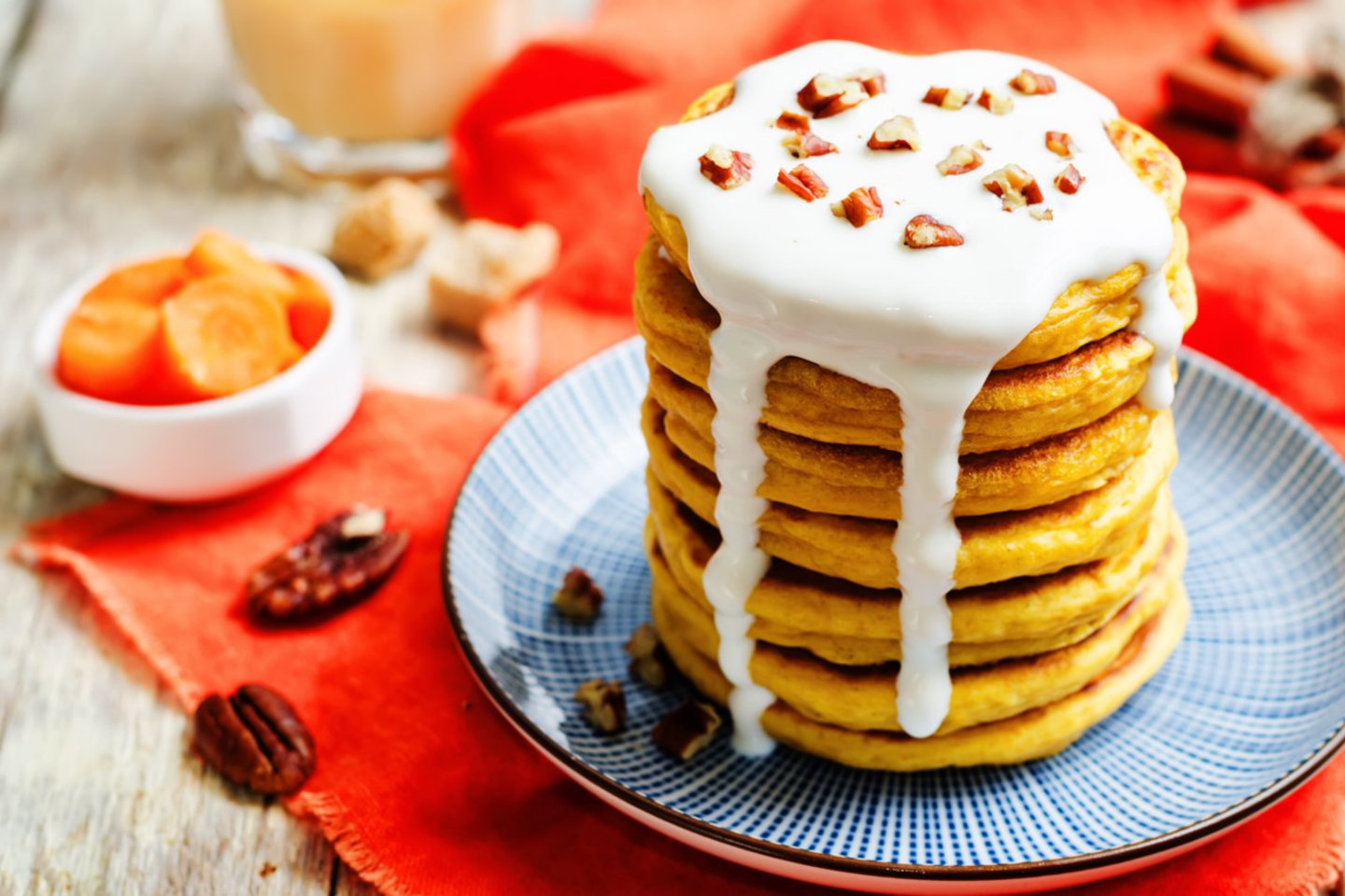 Saldūs ir purūs morkų blyneliai su jogurto ir riešutų padažu