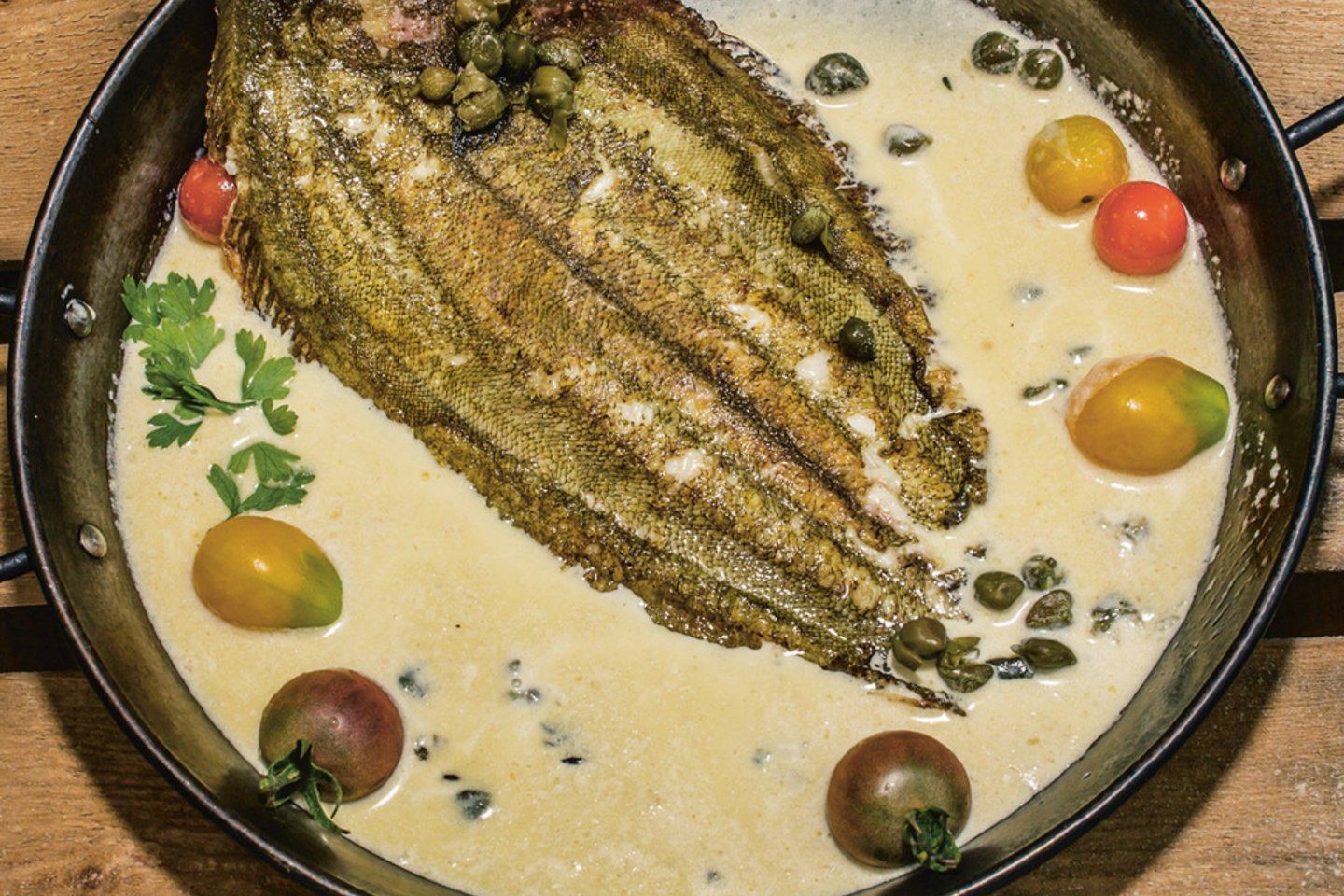 Apkepus abi puses žuvį dar reikia patroškinti prieš tai įpylus grietinėlės ir pagardinus kaparėliais bei vyšniniais pomidorais.