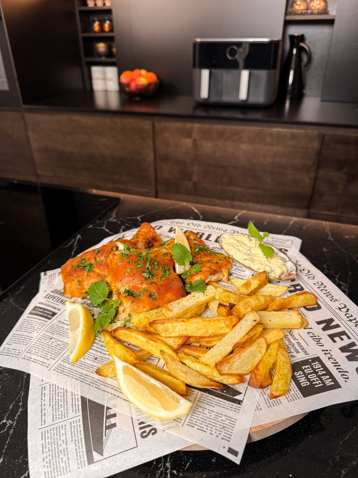 Nepaisant to, kad šiam patiekalui beveik nereikia aliejaus, lėkštėje džiugina toks pat traškus ir gardus, klasikinis „Fish & Chips“ skonis – tik daug gardesnis ir sveikesnis. Karšto oro gruzdintuvėje gaminama žuvis išlieka traškesnė išorėje, bet sultingesnė ir minkštesnė viduje.