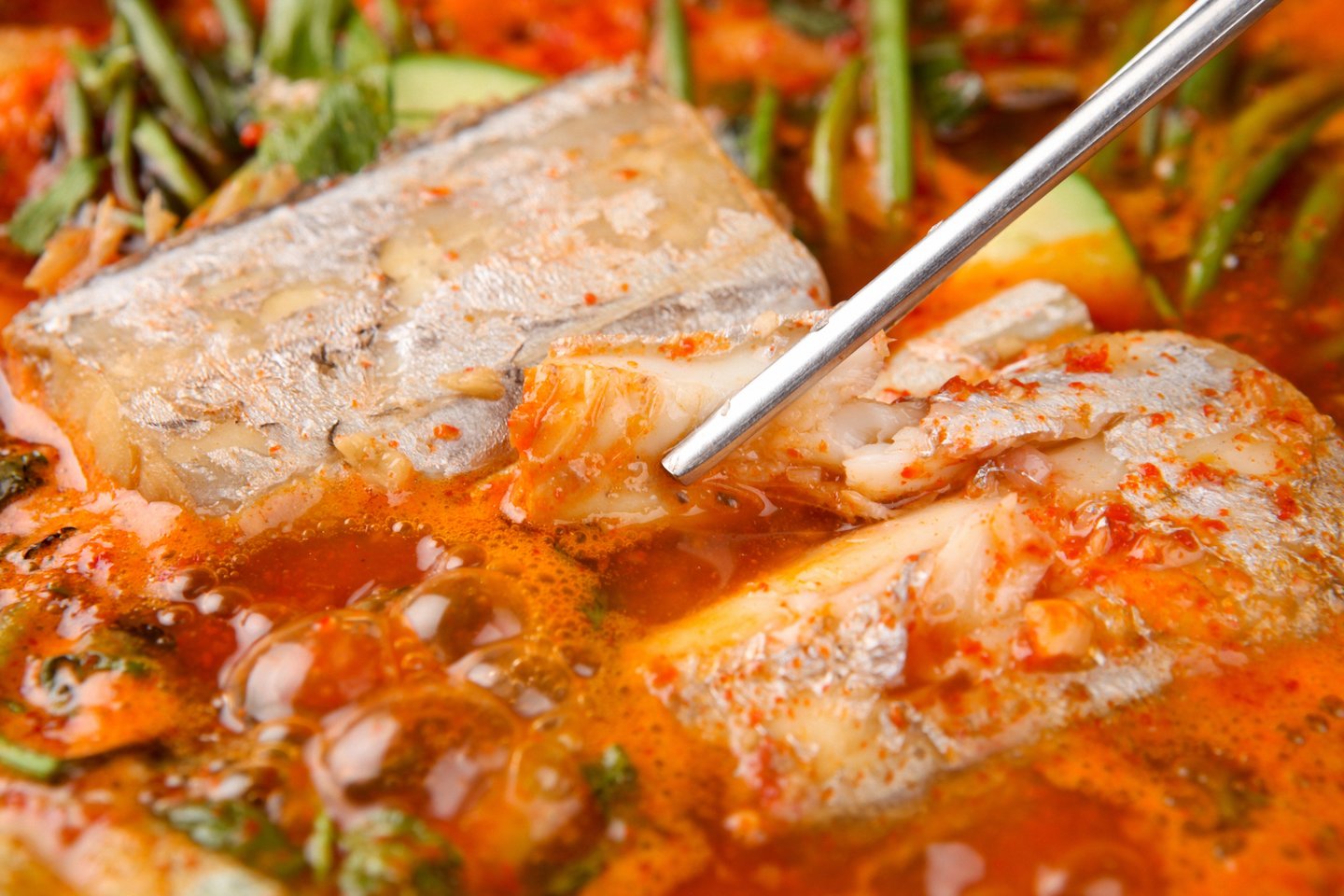 Tada žuvį sudėkite į karščiui atsparią formą, uždenkite daržovių mišiniu, ant viršaus uždėkite lauro lapą ir užberkite porą pipirų grūdelių. Formą uždenkite folija ir įdėkite į 180 °C įkaitintą orkaitę pusvalandžiui. Šis patiekalas nereikalauja įmantrių produktų, yra paprastas ir tinka šeimos vakarienei.