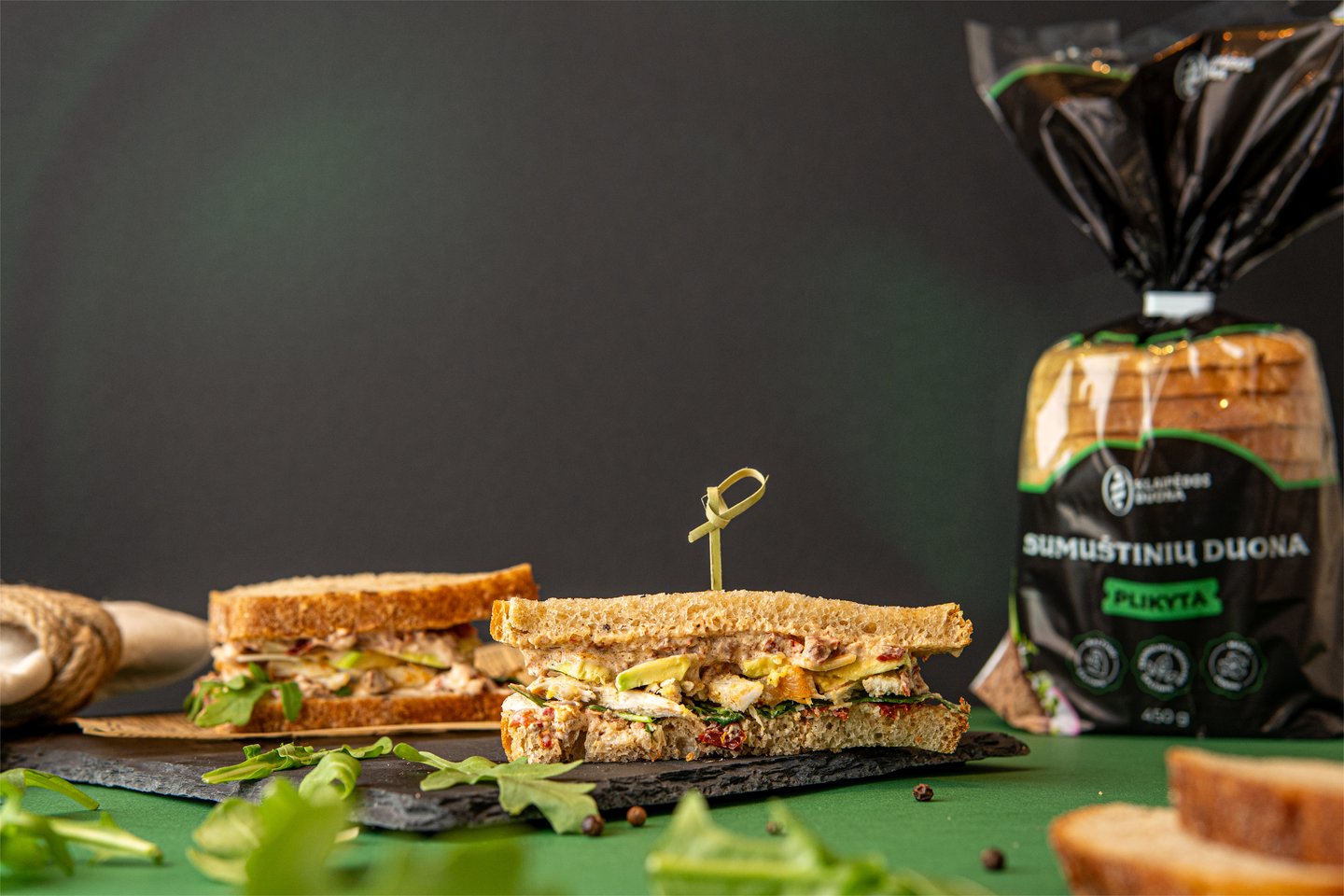 4. Kitą duonos riekę taip pat aptepkite padažu, uždėkite ant viršaus ir perpjaukite sumuštinį į trikampėlius. Tobulas pasirinkimas į darbą ar kelionę.