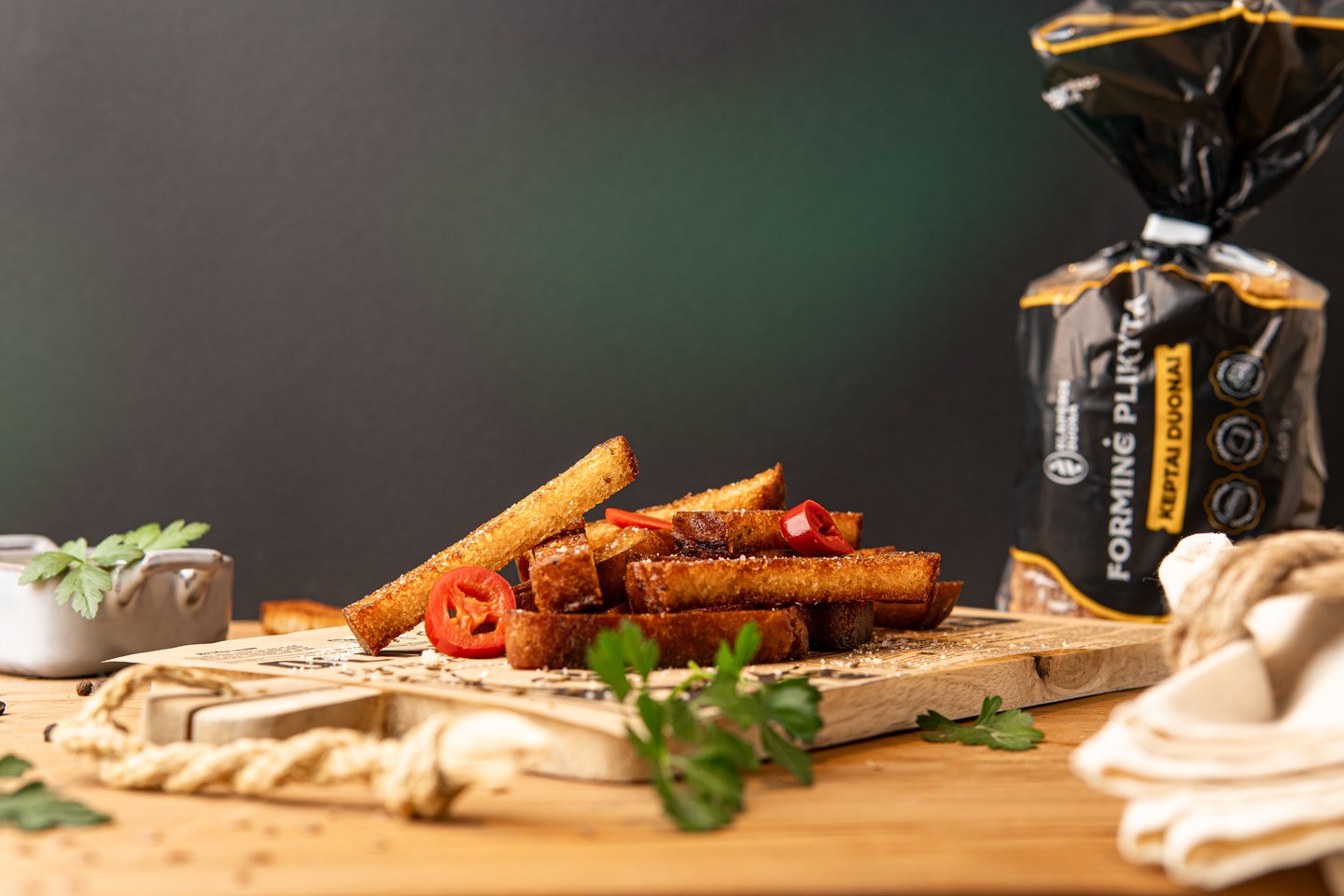 1. Supjaustykite forminę plikytą duoną šiaudeliais, aptepkite alyvuogių aliejumi, pabarstykite prieskoniais.