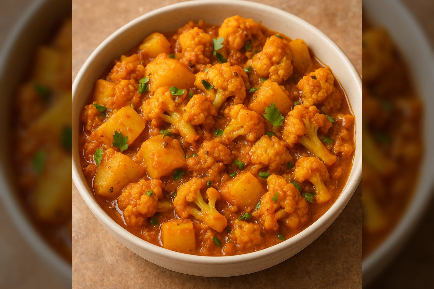 „Labai lengvai pagaminamas receptas su indiškais prieskoniais – paprastas, bet aromatingas vegetariškas bulvių ir žiedinių kopūstų troškinys.