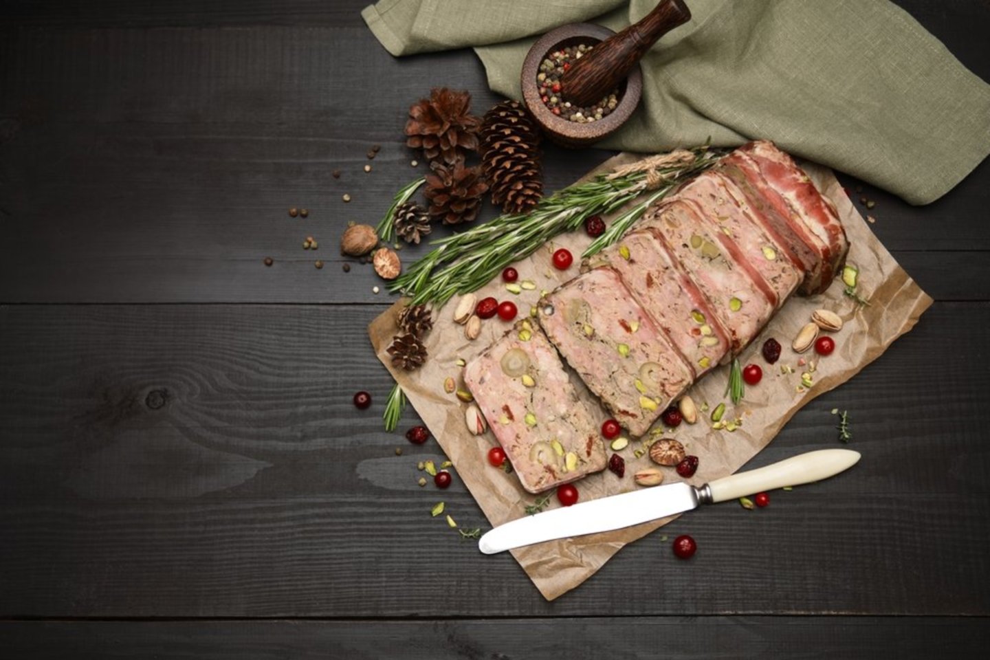Paruoštą teriną padėkite ant lėkštės. Supjaustykite jį riekelėmis ir mėgaukitės šventiškai gardžiu šaltu užkandžiu.