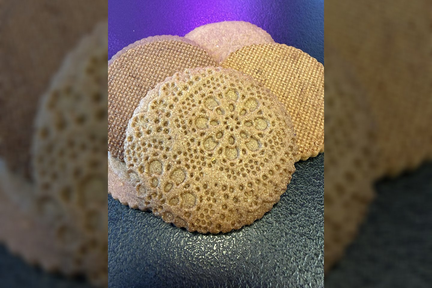 Ant atvėsusios tešlos pabarstyti šiek tiek miltų. Papuošti sausainių paviršių galima specialiais kilimėliais su raštu, antspaudais, o jei tokių namuose neturite – raštą paviršiuje galima suformuoti lengvai į tešlą įspaudžiant nertą močiutės servetėlę.