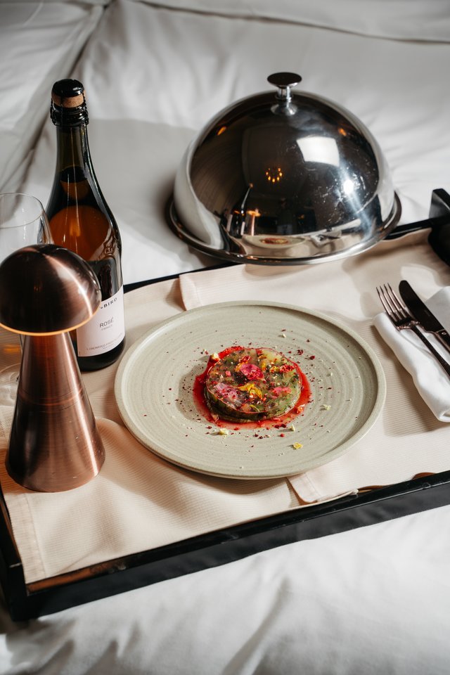 Aplink patiekalą paskleiskite vyšnių padažo, šalia užlašinkite kelis mėtų padažo taškus kontrastui.