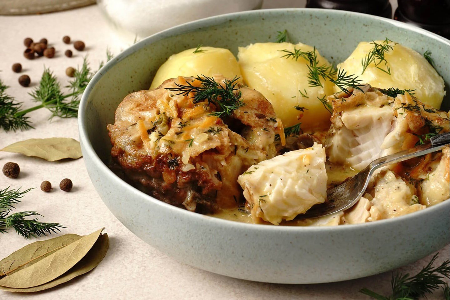 Bet palikime sentimentus nuošaly ir skirkime dėmesį patiekalui. Apkepta, balta, sultinga žuvis tirštame, pasakiško skonio daržovių bei grietinėlės padaže patiekta su virtomis bulvėmis ir šviežiais krapais – tikras komforto maistas.