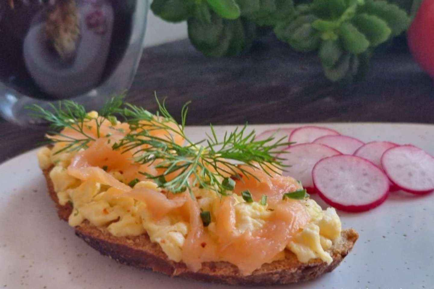 Duonos riekelę/skrebutį sutepiau sviestu, sudėjau kiaušinienę ir ant viršaus uždėjau sūdytos lašišos gabaliukus. Sumuštinius pagardinau džiovintais/smulkintais laiškiniais česnakais ir šviežiais krapais. Skanaus