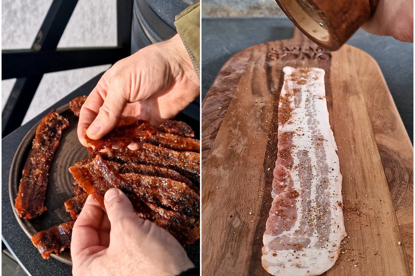 Šoninės juosteles pabarstome ruduoju cukrumi, juodaisiais ir maltais čili pipirais. Guldome ant kepimo akmens, iškloto kepimo popieriumi, ir kepame netiesioginėje kaitroje 150 °C temperatūroje apie 40 minučių. Palaukiame, kol atvės, ir pašlakstome citrinos sultimis.