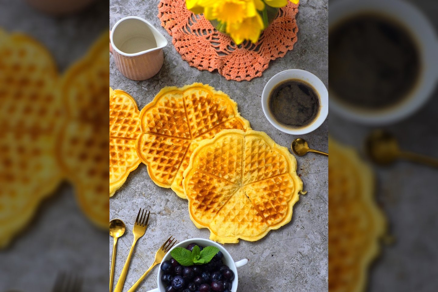 Miltus sumaišome su kepimo milteliais ir įmaišome į kiaušinių masę. Gerai išmaišome. Kepame širdelių vaflinėje, kol apskunda iki norimo lygio.