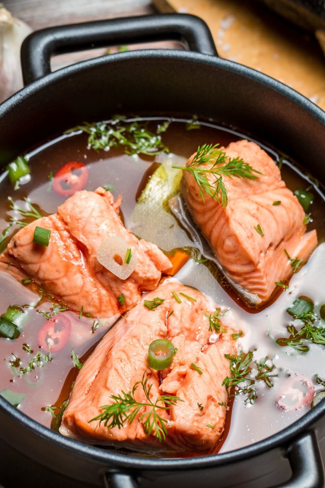 Upėtakio filė nuplaukite, nusausinkite ir supjaustykite norimo dydžio gabalais. Į puodą sudėkite citrinos griežinėlius, pjaustytus porus ir morkas, supilkite sultinį. Užvirkite ir, sumažinę ugnį iki vidutinės, atsargiai sudėkite upėtakio filė. Uždenkite dangčiu ir virkite 8–10 minučių. Patiekite su bulvių koše.