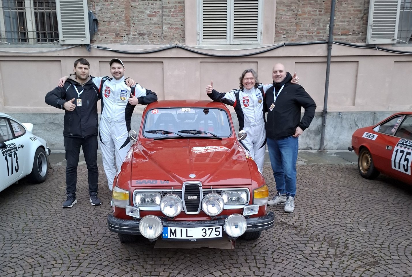 Lietuvos „Vilduja Racing“ ekipažas su savo SAAB automobiliu, paženklintu 174 starto numeriu, kelionę per Alpių serpantinus pradėjo iš Turino.