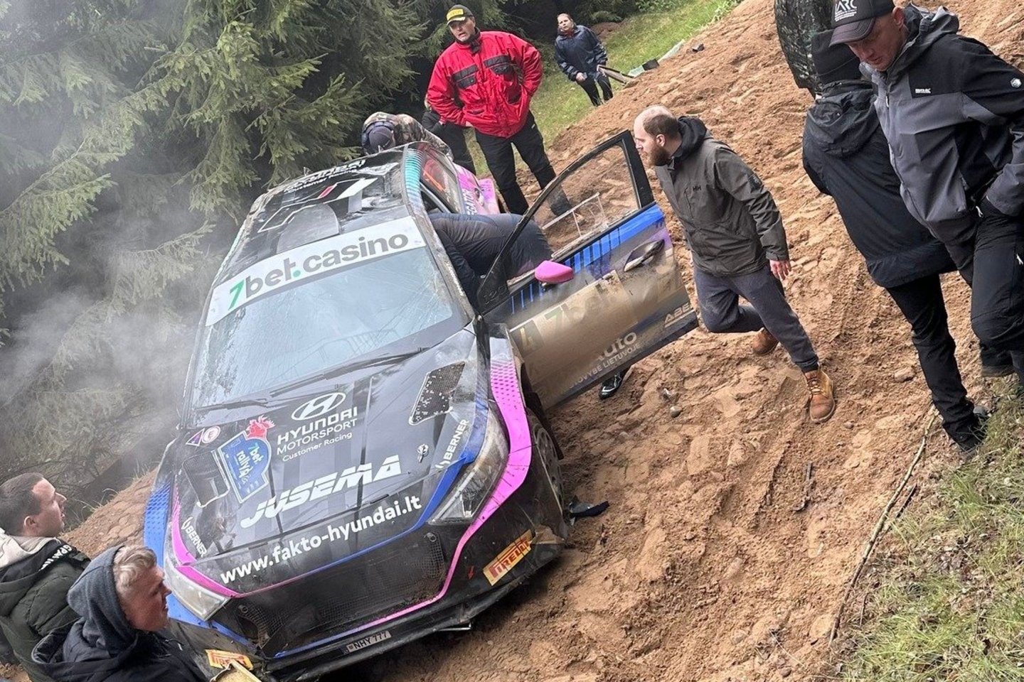 Toje pat vietoje jau po minutės identiška nesėkmė ištiko Roką Steponavičių su Dovydu Ketvirčiu. Nors žiūrovai spėjo šį ekipažą kiek pristabdyti, vaizdas toks, tarsi jie būtų išmetę nematomą inkarą, privirtintą prie „Hyundai i20 Rally2“ priekinės ašies: automobilis vertėsi beveik tiesiai per kapotą.