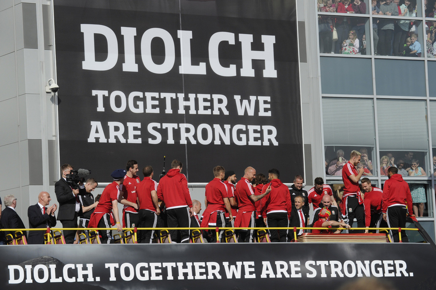 Futbolininkus pasitiko šūkis „Diolch. Together We Are Stronger“ – „Ačiū (velsiečių kalba). Kartu mes esame stipresni“.