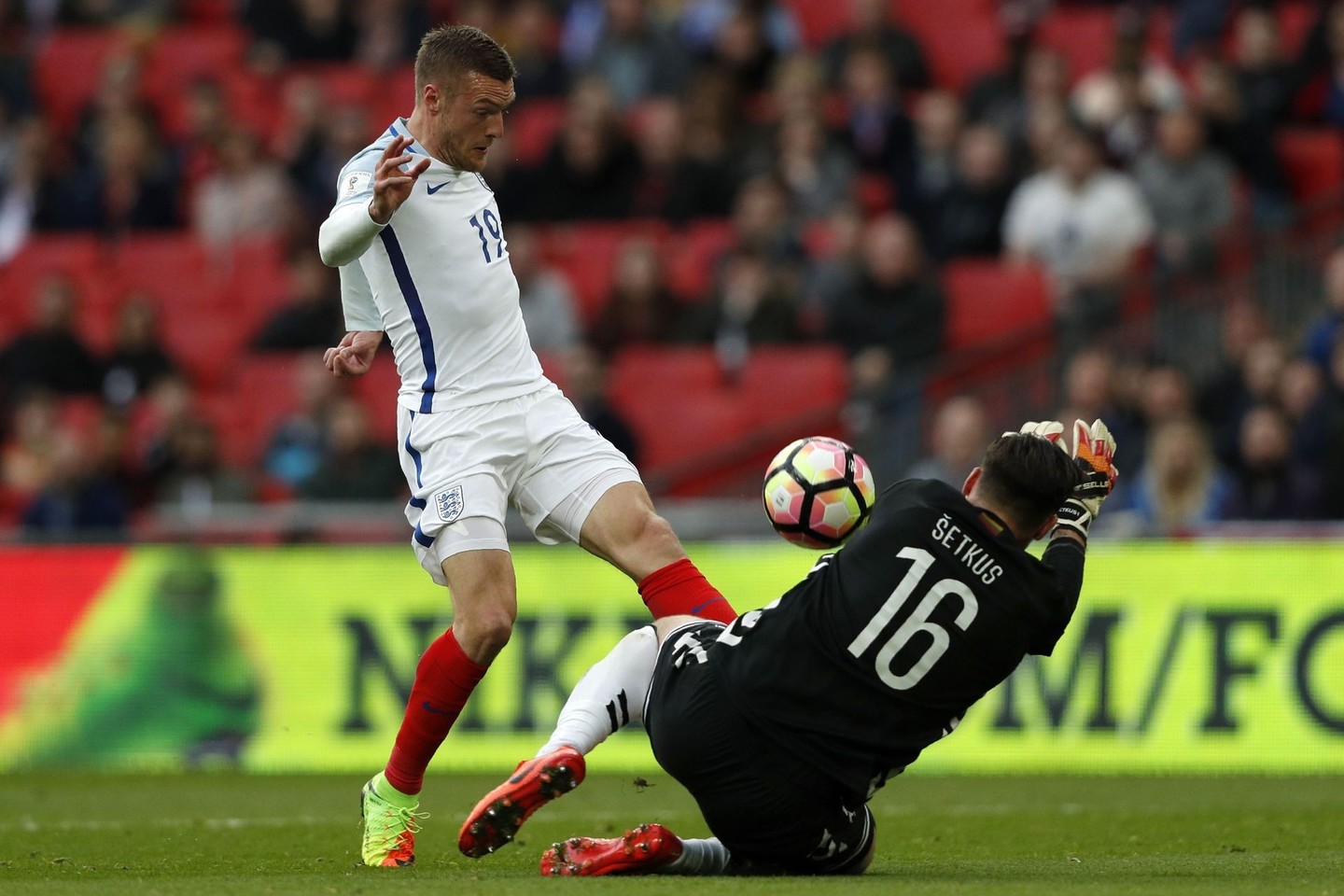 Jamie Vardy be jokio gailesčio baudė Lietuvos rinktinę už grubią klaidą gynyboje. Puikiai įkirtęs ir laisvas likęs 30 metų „Leicester City“ puolėjas žaibiškai nuginklavo Ernestą Šetkų, tačiau kaltinti rinktinės vartininko dėl to tikrai negalima.