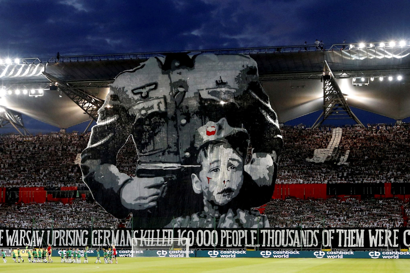 „Per Varšuvos sukilimą vokiečiai nužudė 160 tūkst. žmonių. Tūkstančiai iš jų buvo vaikai“, – buvo parašyta ant plakato, žemiau paveikslo, kuriame vaizduojamas Vokietijos kareivis laiko ginklą vaikui prie veido.