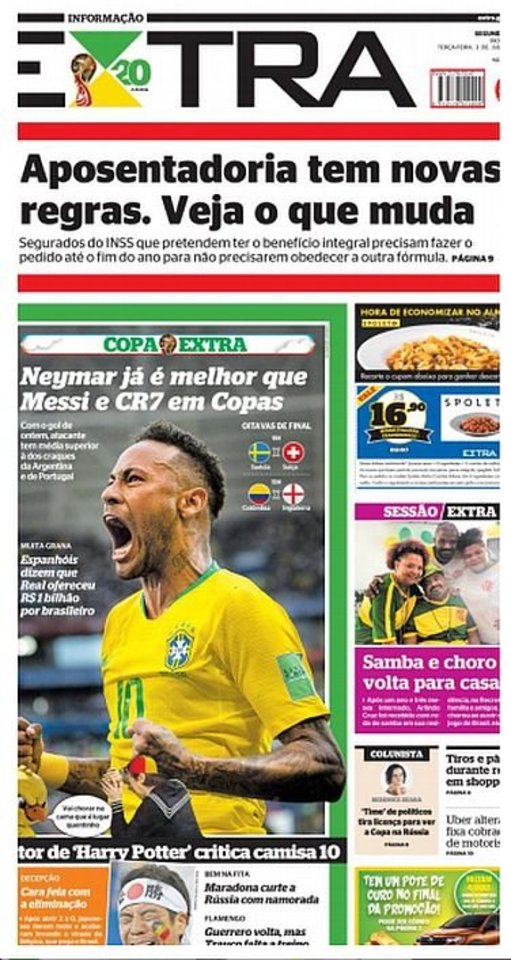 „Extra“ viršelyje antradienį irgi labiau buvo akcentuojama ne rinktinės pergalė aštuntfinalio rungtynėse, o Neymaro asmenybė: „Pasaulio čempionatuose Neymaras geresnis negu Messi ir CR7“.
