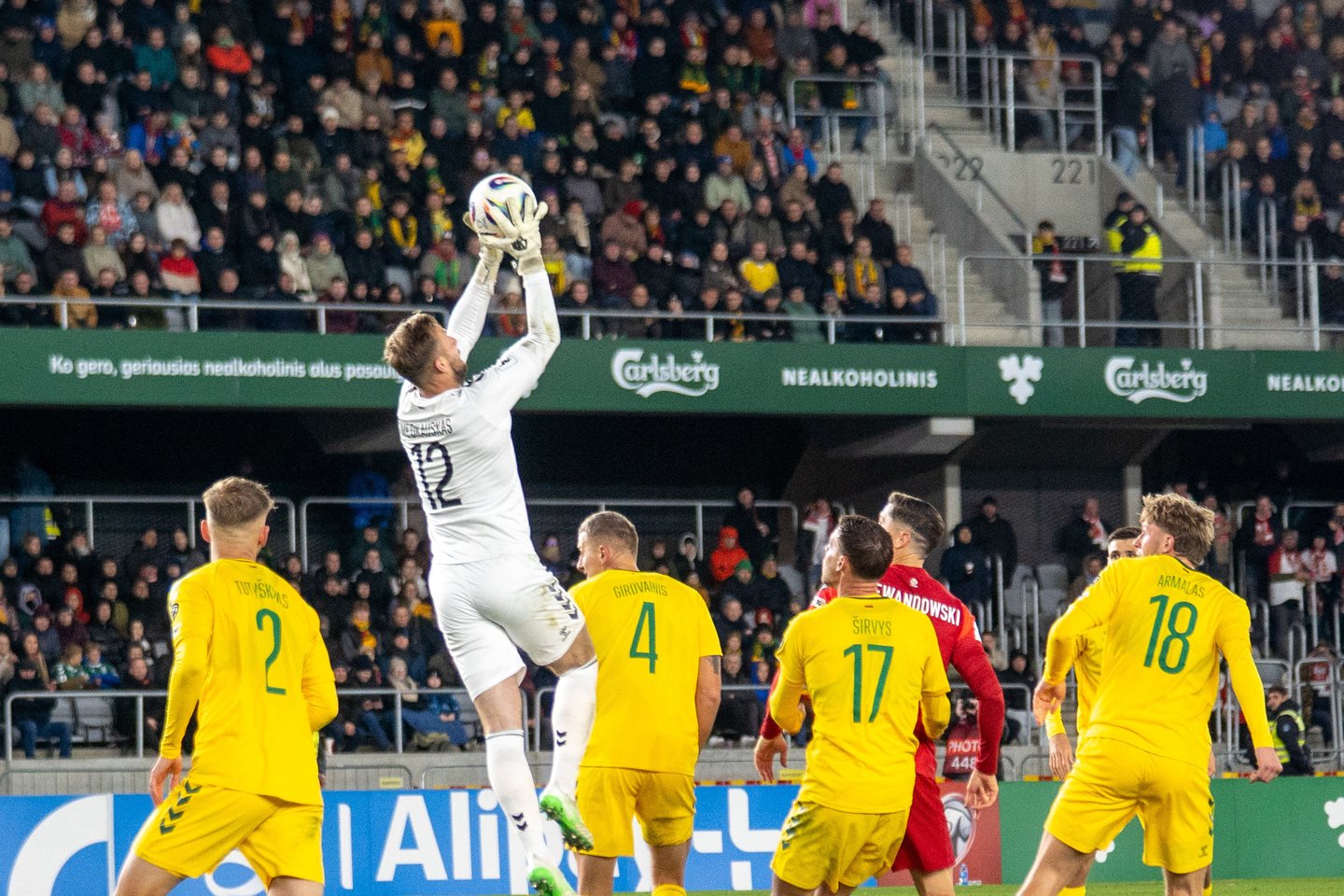 31-erių vartų sargas ne kartą gelbėjo Lietuvos rinktinę nuo varžovų smūgių, tačiau net ir jis liko bejėgis po antrajame kėlinyje galva atliko Roberto Lewandowskio smūgio.