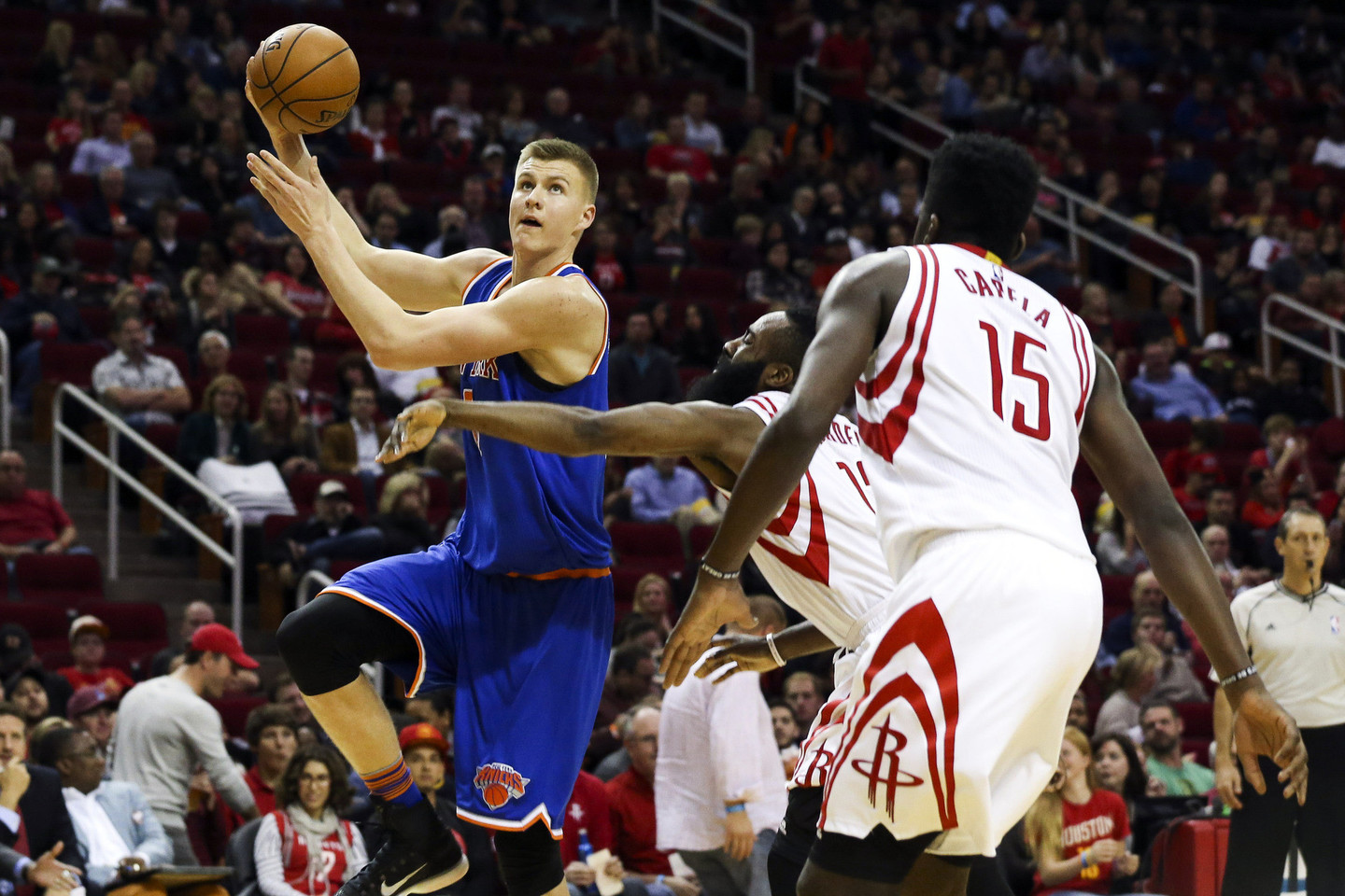 Nors pirmuosius rungtynių taškus pelnė K.Porzingis, susitikimą sėkmingiau pradėjo šį sezoną retai pergales švenčiantys „Rockets“ (5/8) krepšininkai. Įpusėjus ketvirčiui Hiustono ekipa spurtavo 7:0 bei išsiveržė į priekį 15:8. Daugiausiai Robino Lopezo bei Jose Calderono pastangomis, „Knicks“ varžovams neleido atitrūkti, o kėlinį baigė turėdami dviejų taškų deficitą – 24:26.
